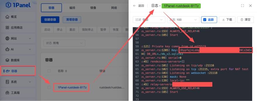 - 在 1Panel 面板左侧菜单找到「容器」,会看一个名称类似「1Panel-rustdesk-XXX」这样的容器;